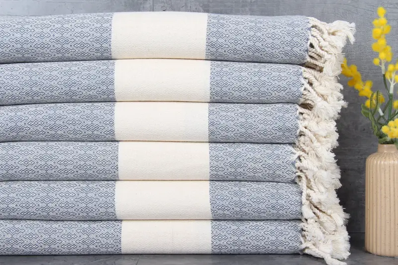 Organic cotton towels, characterized by their 100% natural fiber composition, exhibit high absorbency. Each towel features dimensions of 36x67 inches or 90x170 centimeters, and is hand-woven with tolerances of 1-2.5 cm, ensuring precision. Towels weighing 340 grams are pre-shrunk, resulting in minimal post-wash shrinkage.