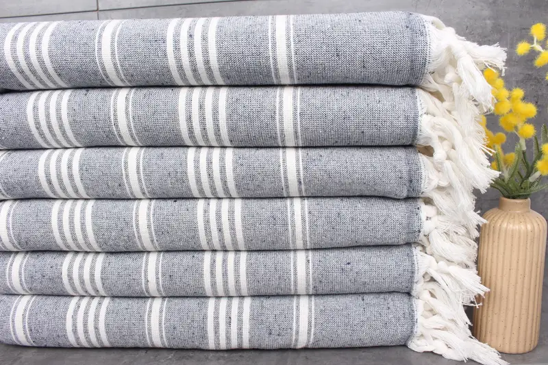 Ensuring superior absorbency and softness, Turkish Towels are crafted from 100% Organic Turkish Cotton, ensuring natural and environmentally friendly fibers. Resulting in a weight of 430 grams and dimensions of 40x71 inches, these towels are characterized by precision in hand-weaving, with tolerances of 1-2.5 cm.