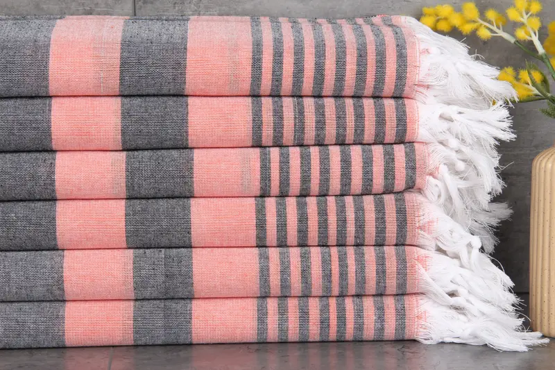Turkish beach towels are characterized by their use of 100% organic Turkish cotton. Ensuring high absorbency and durability, these towels are naturally dyed and exhibit increased absorbency with each wash. Their dimensions are standardized at 36x67 inches, translating to 90x170 centimeters, and they have a weight of 200 grams. Hand-weaving tolerances range from 1 to 2.5 centimeters, providing a slightly imperfect finish typical of artisanal craftsmanship.