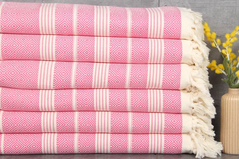 Characterized by superior absorbency, the Turkish Beach Towel is composed of 100% organic Turkish cotton, ensuring a soft, plush texture. Each towel is hand-loomed, with dimensions of 38x69 inches (95x175 cm) and a weight of 440 grams. The towels exhibit tolerances of 1-2.5 cm in size, resulting in a uniform, high-quality product.