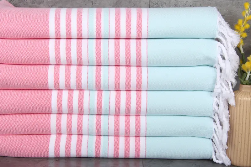 Organic cotton ensures superior absorbency, making the Turkish towels highly efficient. Characterized by 40x67 inches or 100x170 centimeters dimensions and a weight of 220 grams, these towels exhibit slight variations of up to 1-2.5cm due to hand-weaving. Orders can include custom embroidery, and pre-shrunk towels are shipped promptly from warehouses in the US or Turkey. Free shipping applies to orders over 35 USD, with delivery times varying by region. Returns and exchanges follow specified terms on the homepage, ensuring customer satisfaction...