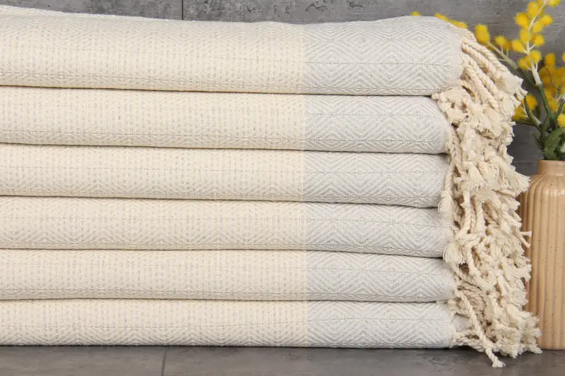 Turkish Towels, blankets, and hand towels are produced from 100% organic Turkish cotton, characterized by their superior absorbency. These products are hand-woven using traditional techniques, resulting in towels with dimensions of 71x40 inches or 180x100 centimeters. Each towel weighs approximately 380 grams, with minor hand-weaving tolerances within 1-2.5 cm.