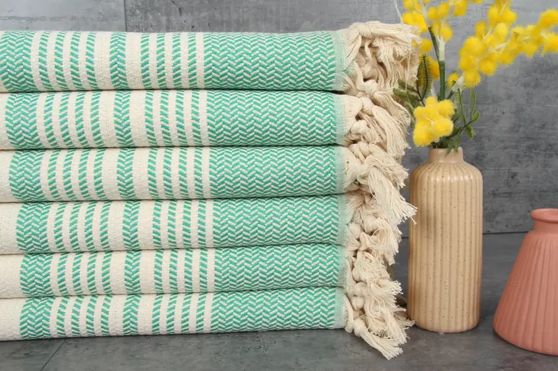 Turkish towels, characterized by their high absorbency, are crafted from 100% organic Turkish cotton, naturally dyed to preserve fiber integrity. These towels have a weight of 230 grams per square meter (GSM) and are available in dimensions of 40x70 inches or 100x180 centimeters, with a hand-weaving tolerance of 1-2.5cm. Their cotton fibers become more absorbent with each wash, enhancing usability.