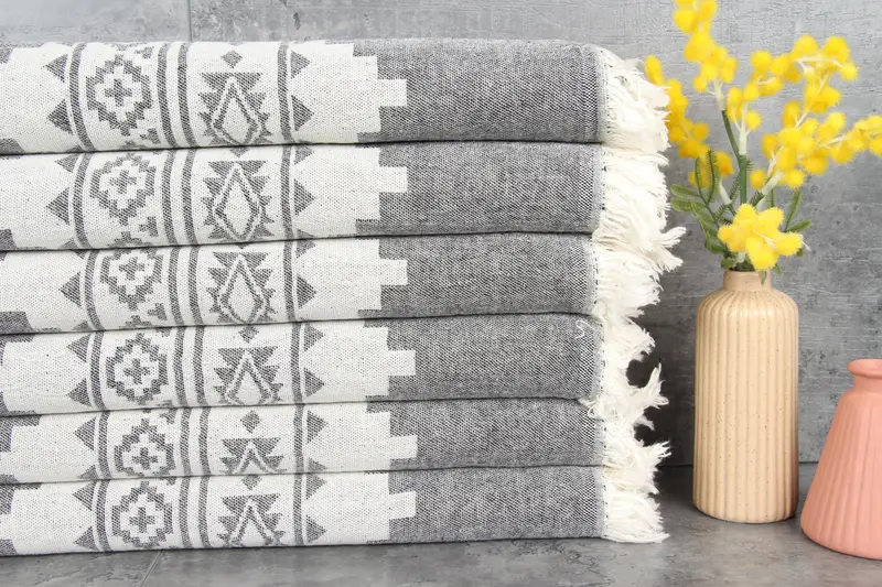 Turkish cotton towels, ensuring sustainability and natural dyeing. Characterized by 100% organic Turkish cotton fibers, these towels are designed to be highly absorbent, reaching an optimal level after the first few washes. The GSM is 220 grams/sq. meters with organic cotton towels sized at 40x70 inches/100x180 centimeters. Hand-weaving allows for tolerances of 1-2.5cm in dimensions.