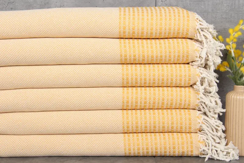 Produced from 100% organic Turkish cotton, these towels and blankets are characterized by their natural dye, ensuring a softer and more stylish product. They are pre-shrunk, weighing 420 grams, and measure 36x69 inches (90x175 centimeters). Hand-weaving tolerances of 1-2.5cm are noted.