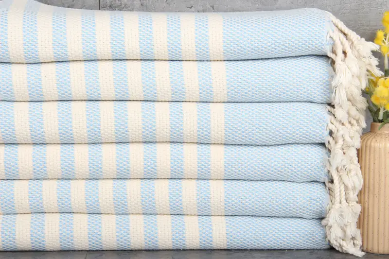 Dimensions of the towels are set at 67x40 inches or 170x100 centimeters, with a weight of 380 grams, ensuring they are both durable and lightweight. Hand-weaving allows for a 1-2.5cm tolerance, resulting in unique, artisanal pieces.