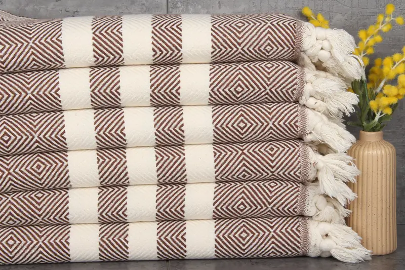 Constructed from 100% organic Turkish cotton, the towels exhibit high absorbency and natural hues resulting from the dyeing process. Each Turkish towel, blanket, or throw, measuring 20x32 inches (50x80 centimeters) and weighing 100 grams, is meticulously hand-woven, with a tolerance of 1-2.5cm.
