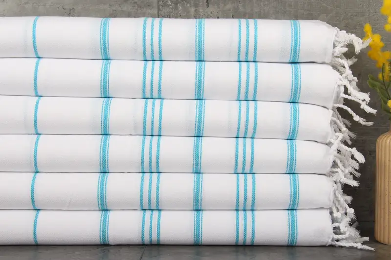 The product is characterized by 100% organic Turkish cotton, ensuring durability and natural absorption properties. Each towel and blanket weighs 100 grams, measuring 24x36 inches or 60x90 centimeters, with a tolerance of 1-2.5 cm due to hand-weaving. Embroidery customization is available, with expedited shipping options from warehouses in the US and Turkey. Pre-shrunk Turkish towels and blankets are shipped the same day for orders over 35 USD, with free shipping for orders exceeding this amount. Return and exchange policies are detailed on the...