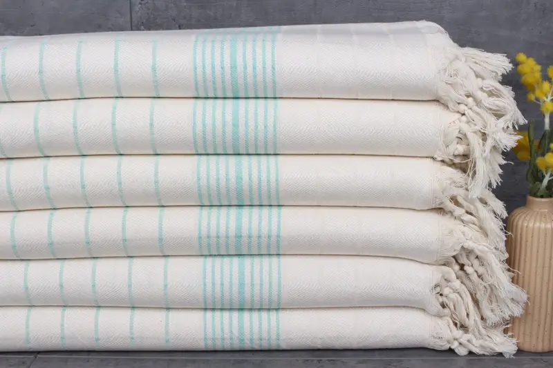 Characterized by their fiber composition, these towels are crafted from 100% organic Turkish cotton. This material choice ensures superior absorbency and durability, resulting in towels that become even more absorbent with each wash. Ensuring comfort and versatility, these towels measure 40x71 inches or 100x180 centimeters with a weight of 370 grams, allowing for varied applications.