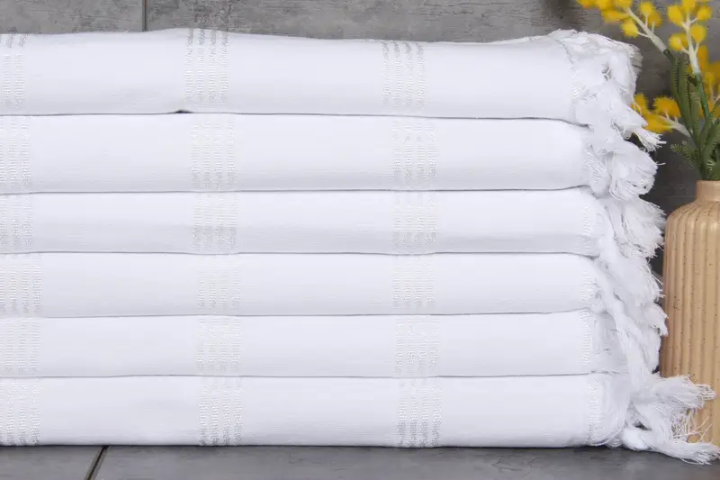 The Turkish Towels are composed of 100% organic Turkish cotton, characterized by natural dyeing, ensuring vibrant and eco-friendly colors. These towels are meticulously hand-woven, resulting in a weight of 300 grams and dimensions of 40x71 inches or 100x180 centimeters. Each towel exhibits a slight tolerance of 1-2.5cm in measurements due to the hand-weaving process.