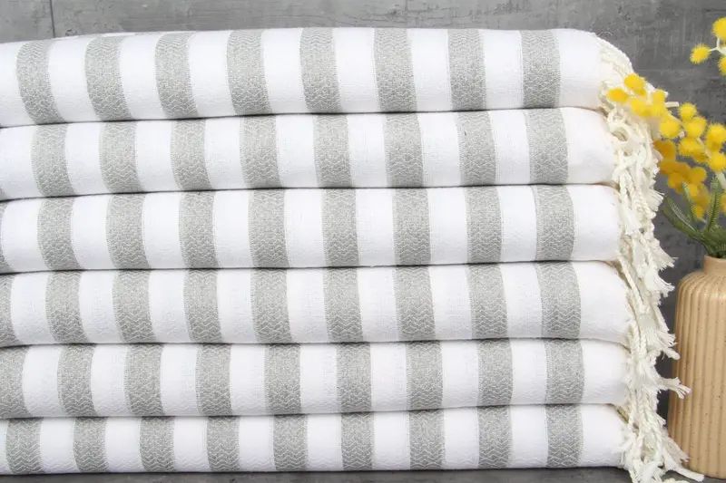 Turkish cotton ensures softness and durability, characterized by its natural dyeing process and %100 organic material. The towels, measuring 36x71 inches or 90x180 centimeters, weigh 340 grams with tolerances of 1-2.5cm due to hand-weaving. Embroidery customization and pre-shrunk status are available, with shipping from the US warehouse for US customers and Turkey for international orders. Free shipping is offered for orders over 35 USD, with detailed return and exchange policies available.