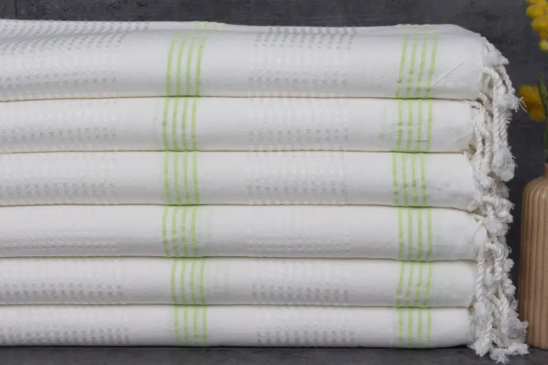 Constructed from 100% organic Turkish cotton, the towels are natural dyed, ensuring eco-friendly and sustainable usage. Measuring 36x67 inches (90x170 centimeters) and weighing 280 grams, these towels exhibit high absorbency. Hand-woven with a tolerance of 1-2.5 centimeters, they offer a distinctive texture.