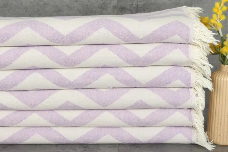The 24x40 inches Purple Cotton Hand Towels are characterized by their zigzag design, incorporating a secondary color of beige. The material, which is primarily organic and recycled cotton, ensures high absorbency and durability, resulting in an exceptionally soft texture. Each towel weighs 125 grams, featuring a dimension of 40x24 inches (60x100 centimeters) with a hand-weaving tolerance of 1-2.5cm.
