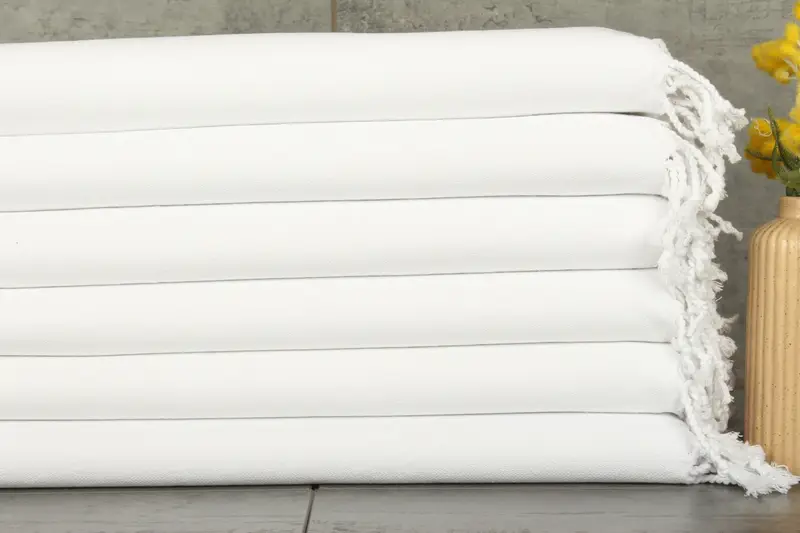 Ensured by Turkish cotton, the towel material is characterized by its absorbency and durability. The towels are made from a blend of organic and recycled cotton, with a weight of 130 grams and dimensions of 40x18 inches or 45x100 centimeters. Hand-woven techniques result in tolerances of 1-2.5cm in the final product.