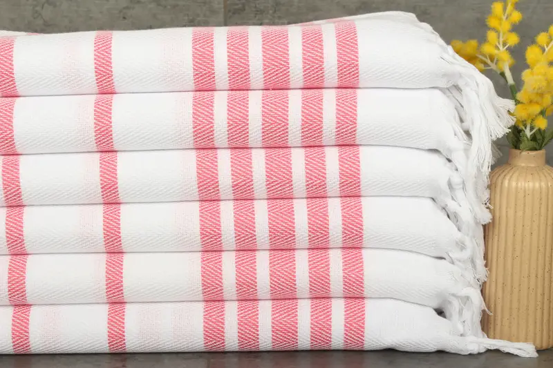 The Turkish Hand Towel is characterized by its fiber composition, crafted from 100% organic Turkish cotton, ensuring a natural dyeing process. This results in a towel that is both absorbent and sustainable, with a weight of 120 grams. The dimensions are precisely 24x36 inches or 60x90 centimeters, with a hand-weaving tolerance of 1-2.5 cm.