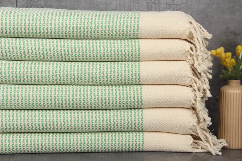 Our Turkish towels and blankets are made from 100% organic Turkish cotton, ensuring superior quality and natural dyeing. Characterized by their high absorbency, the towels are pre-washed to enhance cotton fibers' water retention, resulting in an even more absorbent product over time. Measuring 20x40 inches or 50x100 centimeters and weighing 140 grams, the towels are meticulously hand-woven with a tolerance of 1-2.5 cm.