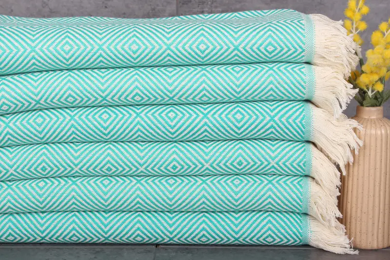 The 20x28 inches Benetton Green Cotton Tea Towel is crafted from sustainable materials, including organic and recycled cotton, ensuring environmental responsibility. Characterized by its robust fiber composition, this towel offers superior absorbency, enhancing its usability as a kitchen or bath towel. Each piece is meticulously hand-woven, resulting in slight variations within the tolerance of 1-2.5 cm.