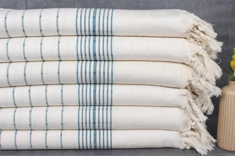 Ensuring superior absorbency, the Turkish towels are crafted from 100% organic Turkish cotton, resulting in natural-dyed hues. Characterized by a weight of 370 grams, these towels are organically woven to dimensions of 40x71 inches or 100x180 centimeters, with hand-weaving tolerances of 1-2.5 cm.