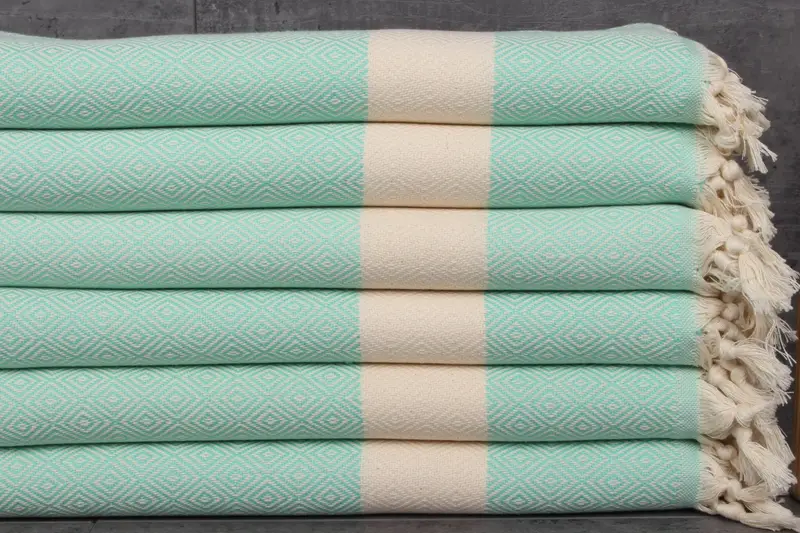 Organic cotton composition ensures high absorbency, characterized by natural dyeing processes. Towels measure 20x36 inches (50x90 centimeters) and weigh 115 grams. Hand-weaving tolerances allow for variations up to 2.5 centimeters.