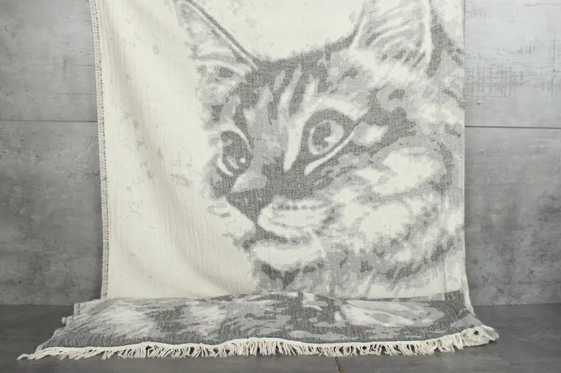 The blanket consists of a multi-material composition ensuring a blend of recycled and organic cotton fibers. Characterized by their high absorbency, these Turkish cotton blankets retain moisture effectively, absorbing up to 840 grams per blanket. Each blanket, sized at 63x87 inches (160x220 centimeters), weighs approximately 840 grams, with a tolerance of 1-2.5 centimeters in hand-weaving dimensions.