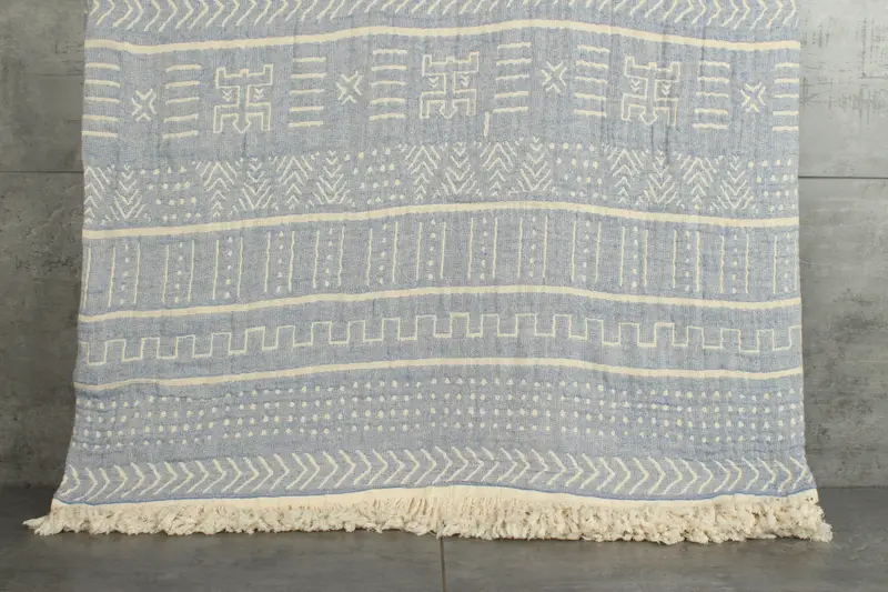 The product is composed of cotton, ensuring optimal absorbency and softness. Dimensions are defined as 91x79 inches or 200x230 centimeters, with a tolerance of 1-2.5cm for hand-woven items. The weight of the blanket is specified at 1800 grams.