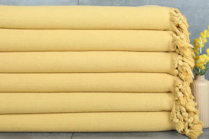 Turkish cotton blankets, featuring a combination of recycled and organic cotton, ensure high absorbency and sustainability. The blankets are characterized by a dimension of 87x69 inches (220x175 cm) with a tolerance of 1-2.5 cm, ensuring precision in hand-weaving techniques. Custom embroidery is available with an additional 2-day processing time. Pre-shrunk and ready for immediate use, these blankets are shipped with expedited delivery options and come with a satisfaction guarantee for returns or exchanges.