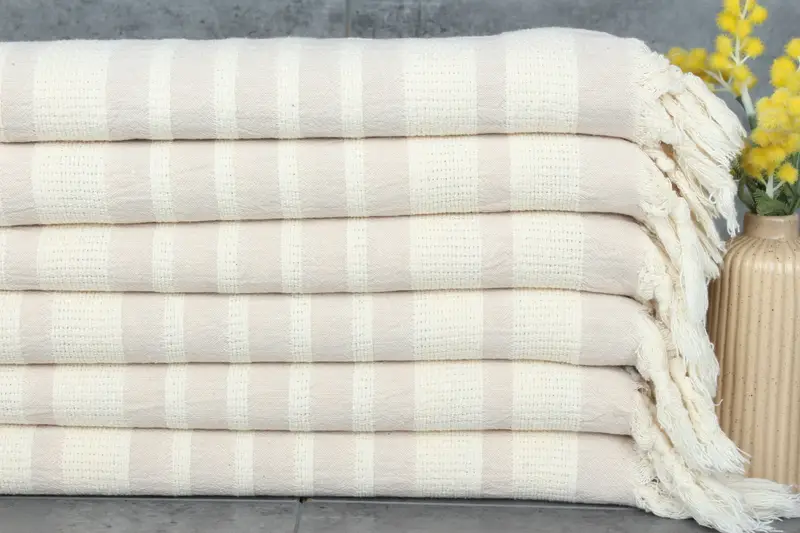 Turkish cotton towels are characterized by their high absorbency and durability, ensuring they are suitable for a variety of uses. These towels, made from 100% organic Turkish cotton, are hand-woven to maintain consistency in thickness and texture. Each towel weighs 120 grams and is available in a standard size of 18x36 inches (45x90 centimeters), with a weaving tolerance of 1-2.5 cm.