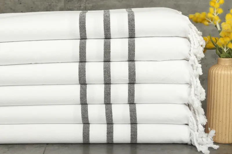 These towels are characterized by their organic and recycled cotton composition, ensuring superior absorbency and sustainability. Organic cotton towels measure 40x18 inches or 45x100 centimeters, with hand-weaving tolerances between 1 to 2.5 centimeters. Towels exhibit a weight of 130 grams, enhancing their durability.