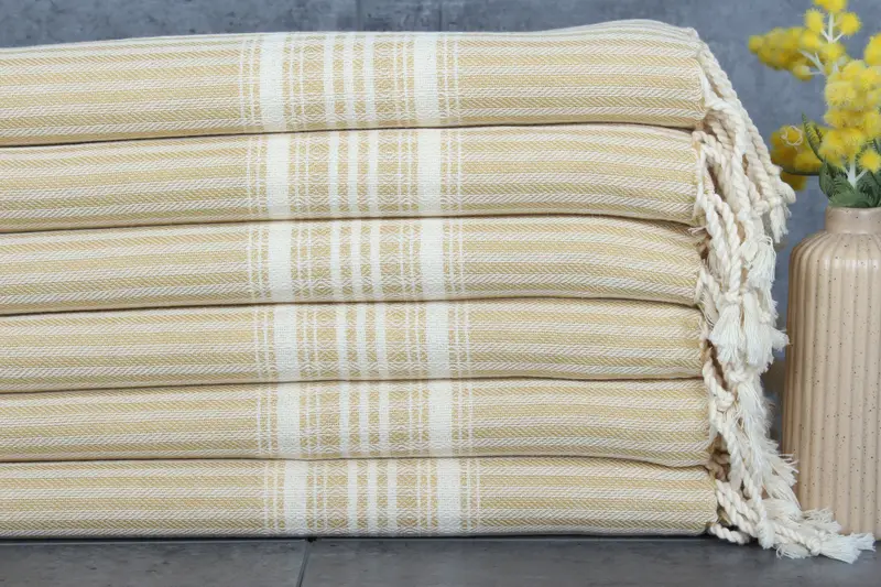 Characterized by a fiber composition of 100% organic Turkish cotton, the towel ensures enhanced absorbency and softness. Each piece measures 18x40 inches or 45x100 centimeters, weighing approximately 90 grams, ensuring durability while maintaining a lightweight feel. Hand-woven to allow for minor size variations of 1-2.5 cm.