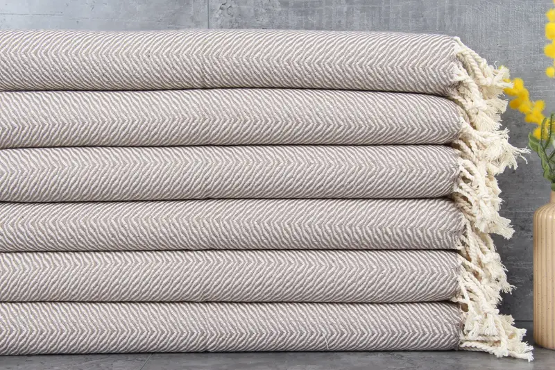 The Turkish towels and blankets are distinguished by their 100% organic Turkish cotton composition, ensuring optimal absorbency and softness. Turkish towels are made from organic cotton fibers, providing exceptional moisture absorption, which improves with each wash. The cotton fibers, sourced sustainably, enhance durability while retaining a natural aesthetic.