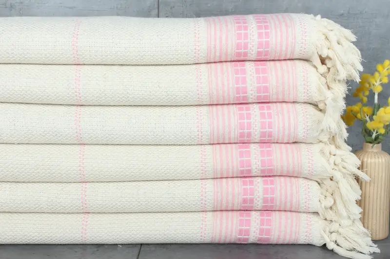 Dimensions of the Turkish towels and blankets are specified in inches and centimeters, ensuring precision. The organic cotton towels and throws have a size of 95x9...