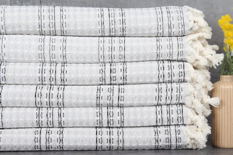 Characterized by %100 organic Turkish cotton, these towels and blankets ensure superior softness and durability. Resulting in a natural dyeing process, their colors remain vibrant wash after wash. These items are meticulously woven by hand, resulting in a gentle tolerance of 1-2.5 cm in dimensions.