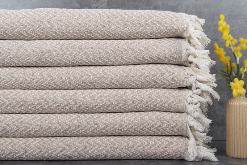 Turkish towels and blankets are distinguished by their 100% organic Turkish cotton composition, contributing to their high absorbency and durability. The products weigh 734 grams, ensuring substantial thickness and warmth. Organic cotton fibers yield towels and blankets that are characterized by a 63x75 inches (160x190 centimeters) size, with hand-weaving tolerances ranging from 1 to 2.5 cm.