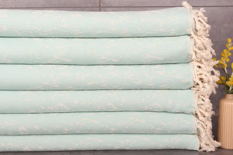 The product is characterized by its fiber composition, mainly organic Turkish cotton, ensuring superior absorbency and quality. The blanket features a weight of 1400 grams and dimensions of 93x71 inches, translating to 180x235 centimeters. It is hand-woven, with tolerances ranging from 1 to 2.5 cm, allowing for slight variations.