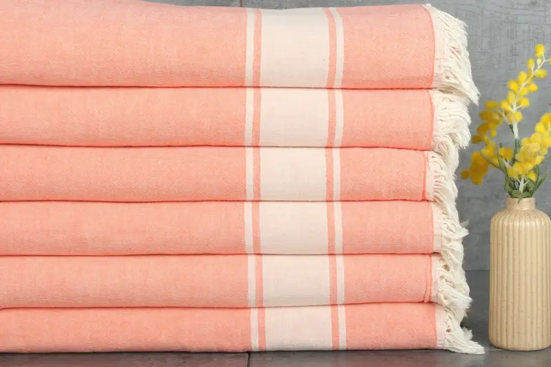 Characterized by their luxurious texture, these blankets are made from Turkish cotton, ensuring superior absorbency and durability. Each blanket weighs 520 grams and measures 60x71 inches, presenting a weight-to-area ratio ideal for versatility. The natural hand-weaving process introduces tolerances of 1-2.5cm in dimensions, resulting in unique artisanal pieces.