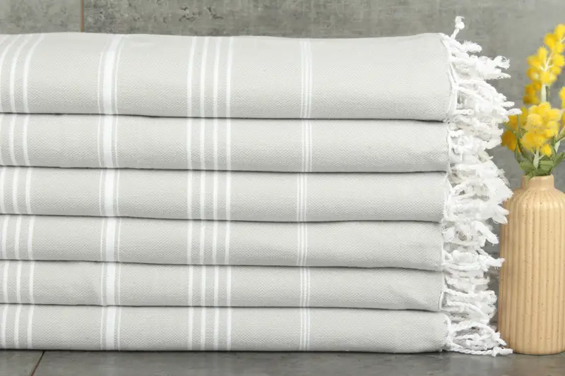 Emphasizing the fiber composition, this product is fabricated from 100% organic Turkish cotton, ensuring superior absorbency and durability. Characterized by its organic material, it weighs 520 grams, measuring 87x63 inches or 160x220 centimeters, with a hand-weaving tolerance of 1-2.5 cm.