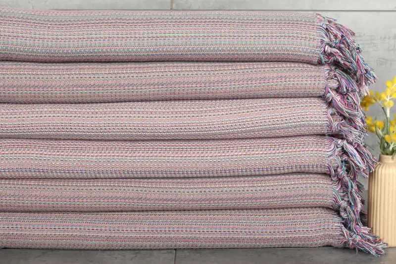 Turkish blankets are crafted from %100 organic Turkish cotton, ensuring superior absorbency and durability. The fiber composition includes recycled cotton and organic cotton, resulting in a sustainable product with natural dye colors. Each blanket measures 89x87 inches (220x225 cm) and weighs 1180 grams, characterized by slight hand-weaving tolerances of 1-2.5 cm.