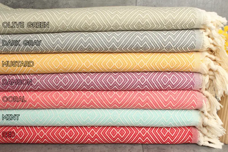 Characterized by their high-quality fiber composition, the Turkish Towels and Blankets are made from 100% organic Turkish cotton, ensuring a soft and durable product. The towels and blankets are GSM 260 grams/sq. meters, featuring a size of 79x91 inches (200x230 centimeters). These products are hand-woven, resulting in minor tolerances of 1-2.5cm.