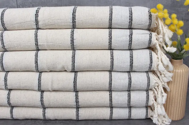 The Turkish towels and blankets are characterized by 100% organic Turkish cotton, ensuring superior softness and absorbency. Resulting in towels weighing 120 grams, these are hand-woven with a tolerance of 1-2.5 cm. The standard dimensions are 20x40 inches (50x100 centimeters), suitable for a variety of uses from beach to home decor.