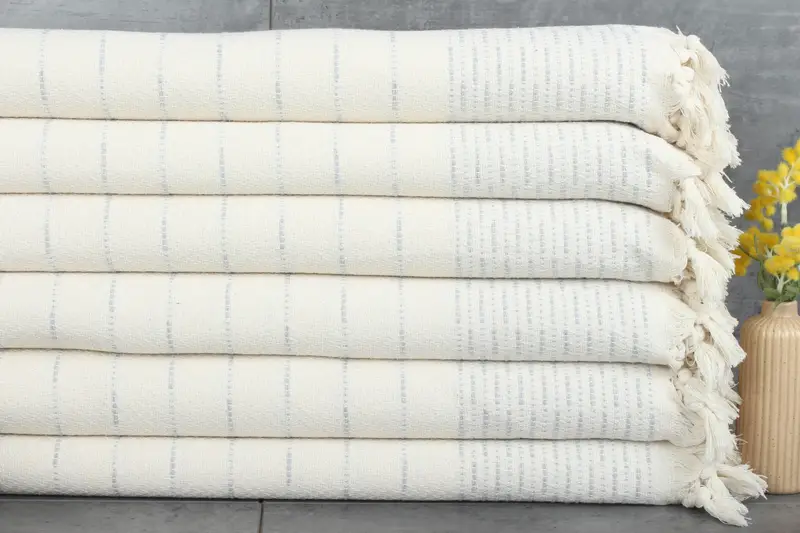 The fiber composition of the throw blanket is characterized by 100% organic Turkish cotton, ensuring superior absorbency and softness. The blanket measures 97 inches by 91 inches (246 cm x 231 cm) and weighs 1220 grams. Tolerances in hand-weaving allow for variations up to 1-2.5 cm in measurements.