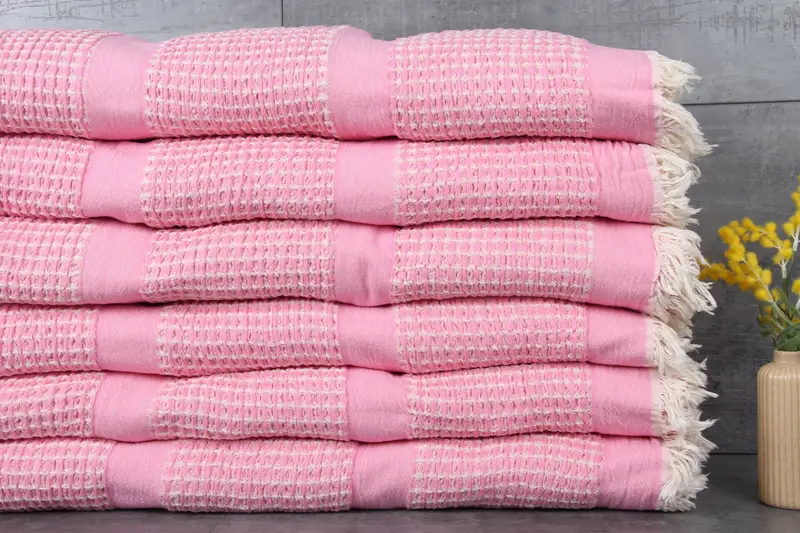 Characterized by a GSM of 220 grams/sq. meters, the Turkish towels and blankets are woven from 100% organic Turkish cotton, ensuring superior absorbency and softness. Each organic cotton towel or throw is sized 40x70 inches/100x180 centimeters, resulting in versatile usage across various applications. Hand-weaving tolerances are typically within 1-2.5 cm, providing a handmade feel to each piece.