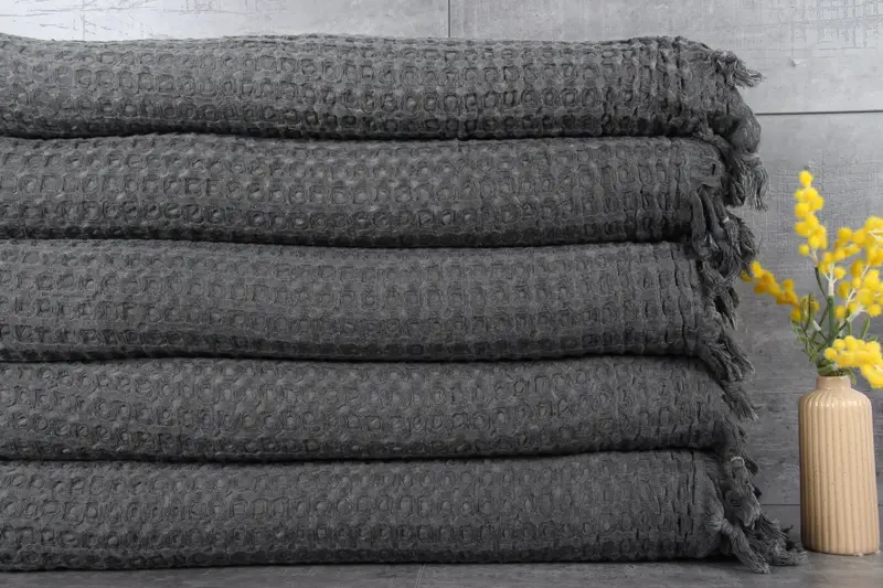 Each Turkish cotton towel and blanket is characterized by its 100% organic Turkish cotton composition, ensuring natural dyeing and enhanced absorbency with each wash. Resulting in towels and blankets that absorb water more effectively with every use, these products are sized at 79x103 inches or 200x260 centimeters with a weight of 1280 grams. Tolerances in hand-weaving range from 1-2.5 cm.