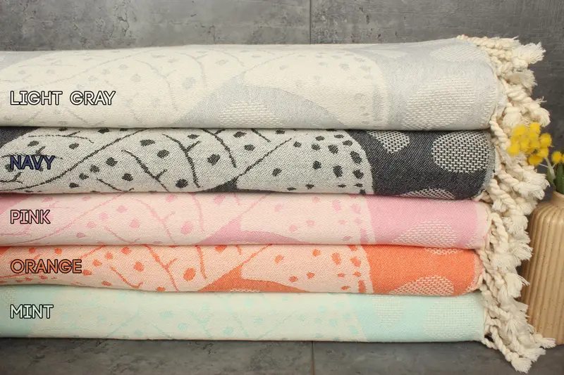 The blanket is characterized by its 100% organic Turkish cotton composition, ensuring enhanced absorbency. Weighing 1200 grams and boasting a size of 99x91 inches (230x250 cm), it features hand-weaving tolerances of 1-2.5 cm.