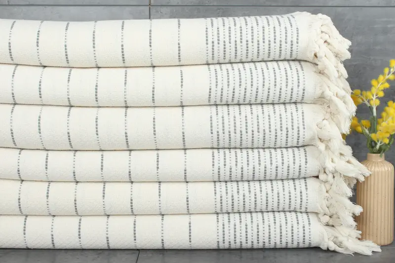 Fiber composition of the blankets includes 100% organic Turkish cotton, ensuring hypoallergenic and eco-friendly properties. Characterized by a weight of 1220 grams and a size of 97x91 inches (230x245 centimeters), these blankets allow for high absorbency. Dimensions are within a tolerance of 1-2.5cm due to hand-weaving techniques.