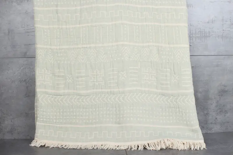 The product is characterized by its Turkish cotton composition, ensuring durability and soft texture. These blankets are made from 100% organic Turkish cotton with dimensions of 91x79 inches or 200x230 centimeters. The weight of each piece is 1800 grams, resulting in a cozy yet lightweight throw.