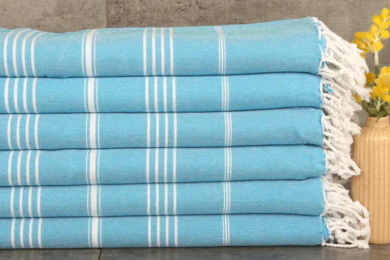 The Turkish blankets and towels are characterized by their high absorbency and soft texture, resulting from a combination of 100% organic Turkish cotton and recycled cotton. Ensuring durability and environmental sustainability, the towels are 87x63 inches (220x160 cm) in size, with a weight of 600 grams per piece. Hand-weaving tolerances typically range between 1 to 2.5 cm.