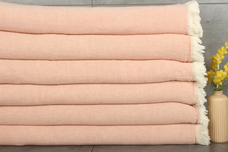 Turkish cotton, characterized by its high absorbency and durability, is the primary material for the towels and blankets. These products are made from 100% organic Turkish cotton, dyed naturally, resulting in a weight of 400 grams and a size of 91x56 inches (230x140 centimeters). Each piece tolerates a 1-2.5 cm hand-weaving variation.