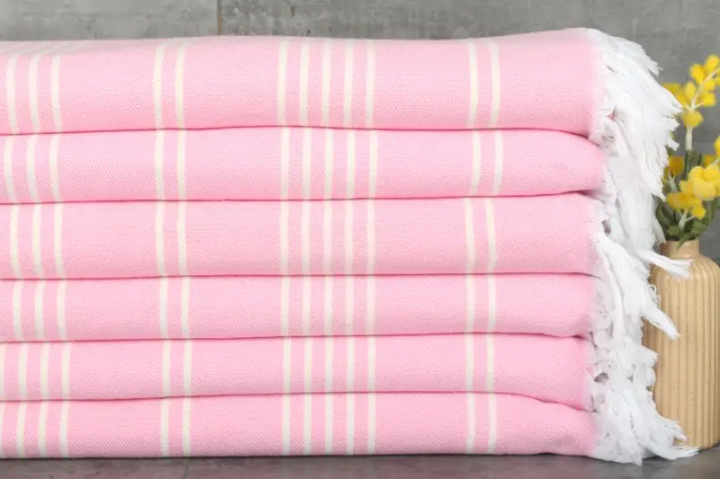 Turkish Towels and Blankets are composed of 100% organic Turkish cotton, ensuring high absorbency and softness. Measuring 95x71 inches or 180x240 centimeters, the weight of these towels and blankets is 850 grams, with hand-weaving tolerances of 1-2.5 cm.