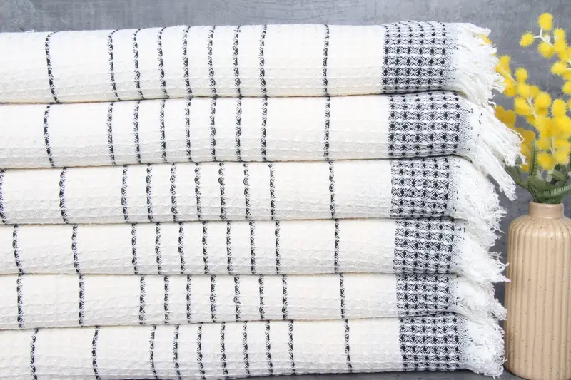 Characterized by their superior absorbency and durability, the Turkish Towels are crafted from 100% organic Turkish cotton. Ensuring a plush texture, these towels, throws, or hand towels weigh 140 grams and are pre-shrunk, minimizing dimensional changes post-wash. Resulting in a natural appearance, the towels are dyed using natural colorants.