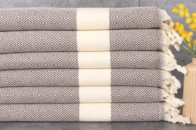 The product is characterized by 100% organic Turkish cotton, ensuring high absorbency and softness. Resulting in a weight of 115 grams, the towels exhibit dimensions of 20x36 inches or 50x90 centimeters. Tolerances in hand-weaving permit variations of 1-2.5 cm.
